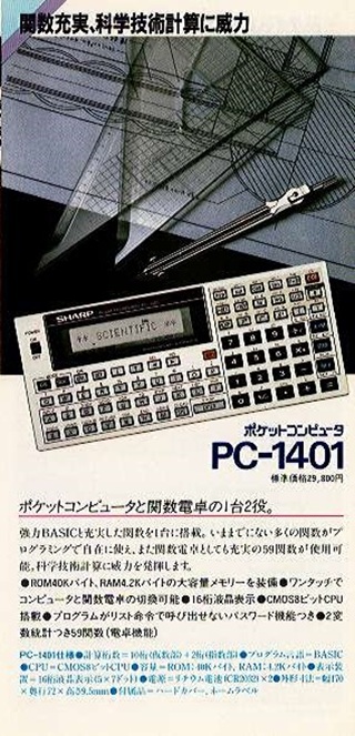PC-1401,1402ESR-H (SC61860) ¥29,800/¥34,800 (1983) ↓ PC-1404G,1405G,1415G ¥OPEN/¥OPEN/¥OPEN (1984) ↓ PC-1416G,1417G,1416GS ¥OPEN/¥OPEN/¥OPEN (1985) ↓ PC-1475,1470U ¥26,800/¥OPEN (1987/03) PC-1431 ¥19,800 (1985[海外向け]) PC-1450 ¥26,800→12,800 (1985) PC-1425 ¥26,800 (1986) ↓ PC-1460 ¥24,800 (1986) PC-1440 ¥17,800 (1985) ↓ PC-1445 ¥17,800 (1986/12)
