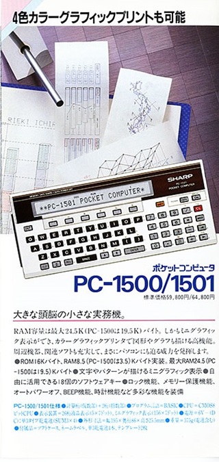 PC-1500LH-5801 1.3MHz ¥59,800 (1981) ↓ PC-1501 LH-5801 2MHz ¥64,800 (1983) ↓ PC-1600K LH-5803 1.3MHz SC7852(=Z80) 3.58MHz ¥69,800 (1986/03)