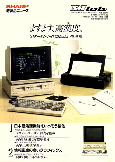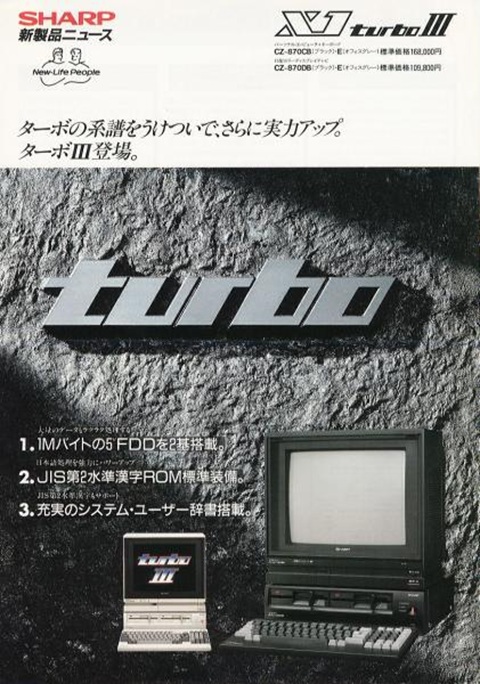CZ-850C (X1turbo model10),851C (20),852C (30)LH0080A(=Z80A) 4MHz ¥168,000/¥248,000/¥278,000 (1984/10) ↓ CZ-862C (X1turbo model40) ¥258,000 (1985/07) ↓ CZ-856C (X1turbo II) ¥178,000 (1985/11) ↓ CZ-870C (X1turbo III) ¥168,000 (1986/11) ↓ CZ-880C (X1turboZ) ¥218,000 (1986/12) ↓ CZ-881C (X1turboZ II) ¥178,000 (1987/12) ↓ CZ-888C (X1turboZ III) ¥169,800 (1988/12)